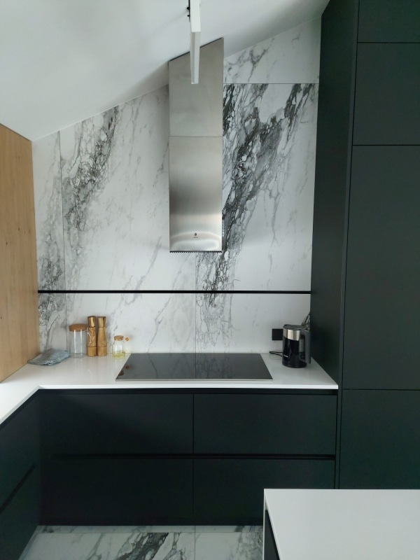 Dla osób, które chciałyby wprowadzić do swojej kuchni czerń, ale jednak mają obawy związane z jej zastosowaniem, pewną opcją może być zestawienie białych mebli kuchennych z czarnym blatem. Zastosowanie dwóch tak uniwersalnych barw jest właściwie gwarancją aranżacyjnego sukcesu. „Czarny blat” może w tym przypadku przybrać postać naturalnego kamienia lub jego imitacji z płyty laminowanej. W grę wchodzi również Corian lub jego odpowiedniki, ale przy wyborze należy zwrócić uwagę, by blat miał jakiś – minimalny chociaż! – wzór. Na jednobarwnym widoczne będzie każde, nawet najmniejsze zarysowanie. W zależności od zastosowanych frontów, możemy uzyskać różny efekt końcowy w aranżacji kuchni. Proste fronty w połączeniu z czarnym blatem dają efekt kuchni minimalistycznej, raczej nowoczesnej, może trochę chłodnej w odbiorze. Ten sam blat w zestawieniu z frontami ramiakowo – płycinowymi pozwoli odnaleźć się miłośnikom stylu klasycznego. Cała frajda w urządzaniu biało – czarnych kuchni polega na umiejętnym żonglowaniu dodatkami tak, by ostatecznie uzyskać wnętrze dopasowane na miarę własnych potrzeb i upodobań. Meble kuchenne w tonacji czarno – białej stanowią do tego doskonałą bazę. Nie ma gotowych i ustalonych schematów, jakie są odpowiednie proporcje poszczególnych barw, bo tak naprawdę w różnych sytuacjach mogą one być inne. Uwarunkowane są one konkretnym pomieszczeniem, ilością wpadającego światła, ale przede wszystkim upodobaniami jego mieszkańców.
