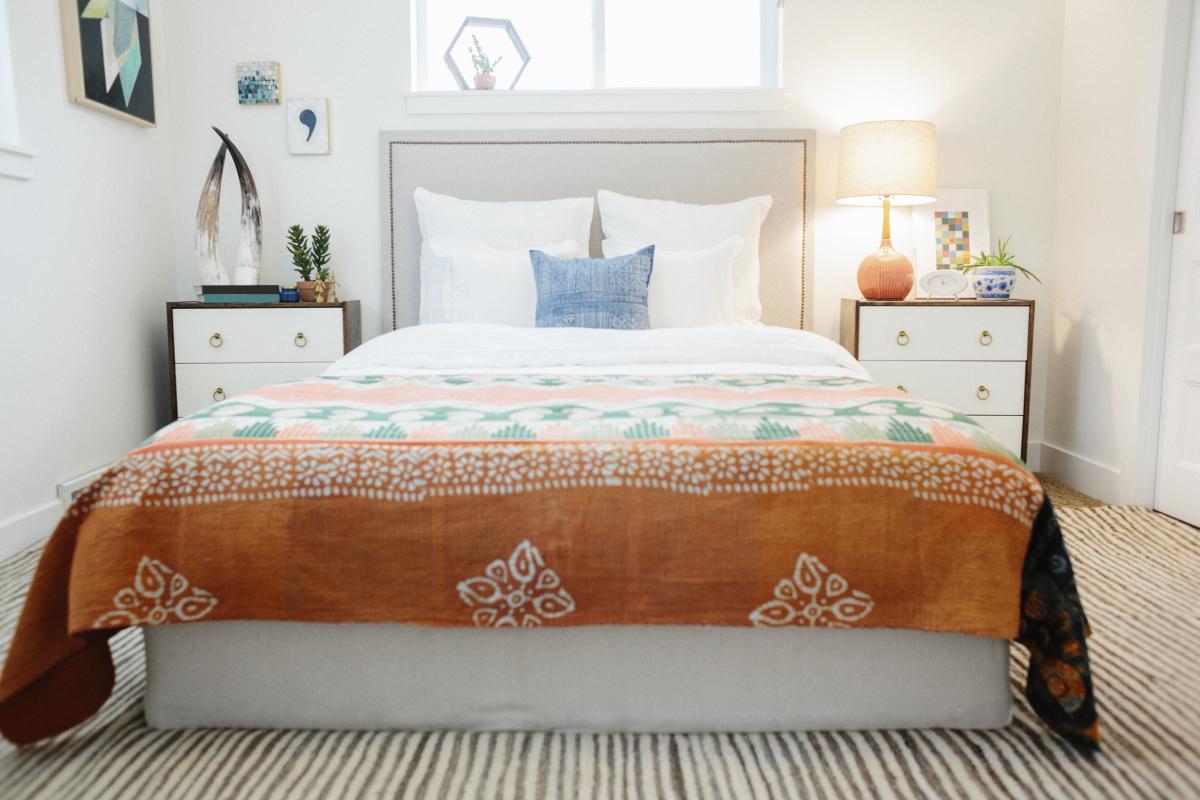 W każdej sypialni kluczową rolę odgrywa łóżko. Musi być ono przede wszystkim funkcjonalne. Wygodny, odpowiednio dobrany materac zapewnia komfort. Drewniana, jasna rama jest dobrym tłem dla pozostałych dodatków, których może być wiele – jasne i wzorzyste poduchy, nakrycia, pufy i koce z frędzlami idealnie dopełnią łóżkową kompozycję.