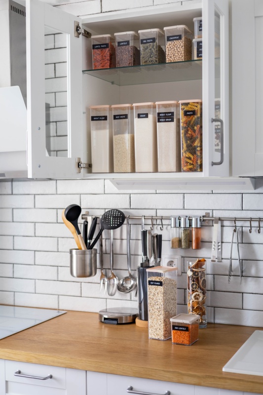Wysokie szuflady dają ogrom możliwości w kwestii przechowywania. To doskonałe miejsce na zastawę stołową, produkty spożywcze czy garnki. Można je oczywiście przechowywać „luzem”, jednak specjalistyczne organizery ułatwią utrzymanie w takich szufladach porządku. Decydując się na przechowywanie w szufladach garnków i patelni warto zaopatrzyć się w specjalny stojak na patelnie (który może również służyć za stojak na pokrywki do garnków lub deski kuchenne). Pionowe ułożenie patelni zniweluje ryzyko uszkodzenia ich powierzchni, do jakiego dochodzi najczęściej przy wkładaniu jednej patelni w drugą. Aby uniknąć podobnych uszkodzeń przy garnkach, warto zainwestować w proste przekładki filcowe. Talerze mogą z kolei być przechowywane w szufladach na dwa sposoby: jeden na drugim, tak jak w klasycznej szafce, albo pionowo w specjalnych stojakach. Szuflady kuchenne to oczywiście również doskonały sposób magazynowania produktów spożywczych. By zachować optyczny porządek, warto zaopatrzyć się w pojemniki o różnej pojemności i przesypywać do nich zawartość torebek przyniesionych ze sklepu. Wymaga to co prawda dodatkowej pracy, ale niesie wiele korzyści. Przede wszystkim, produkty znajdują się w szczelnie zamykanych pudełkach, co zapobiega ich wietrzeniu i szybkiemu psuciu. Po drugie zmniejsza się prawdopodobieństwo, że do szczelnych pojemników dostaną się ewentualne mole spożywcze. Ponadto taki system przechowywania pozwala na szybką ocenę, które produkty trzeba uzupełnić podczas kolejnych zakupów. Nie można również zapominać o aspekcie wizualnym. Jednakowe, ładnie podpisane pojemniki, sprawiają wrażenie porządku i czystości w szufladzie – w przeciwieństwie do pogniecionych torebek i porozrywanych w pośpiechu kartoników.
