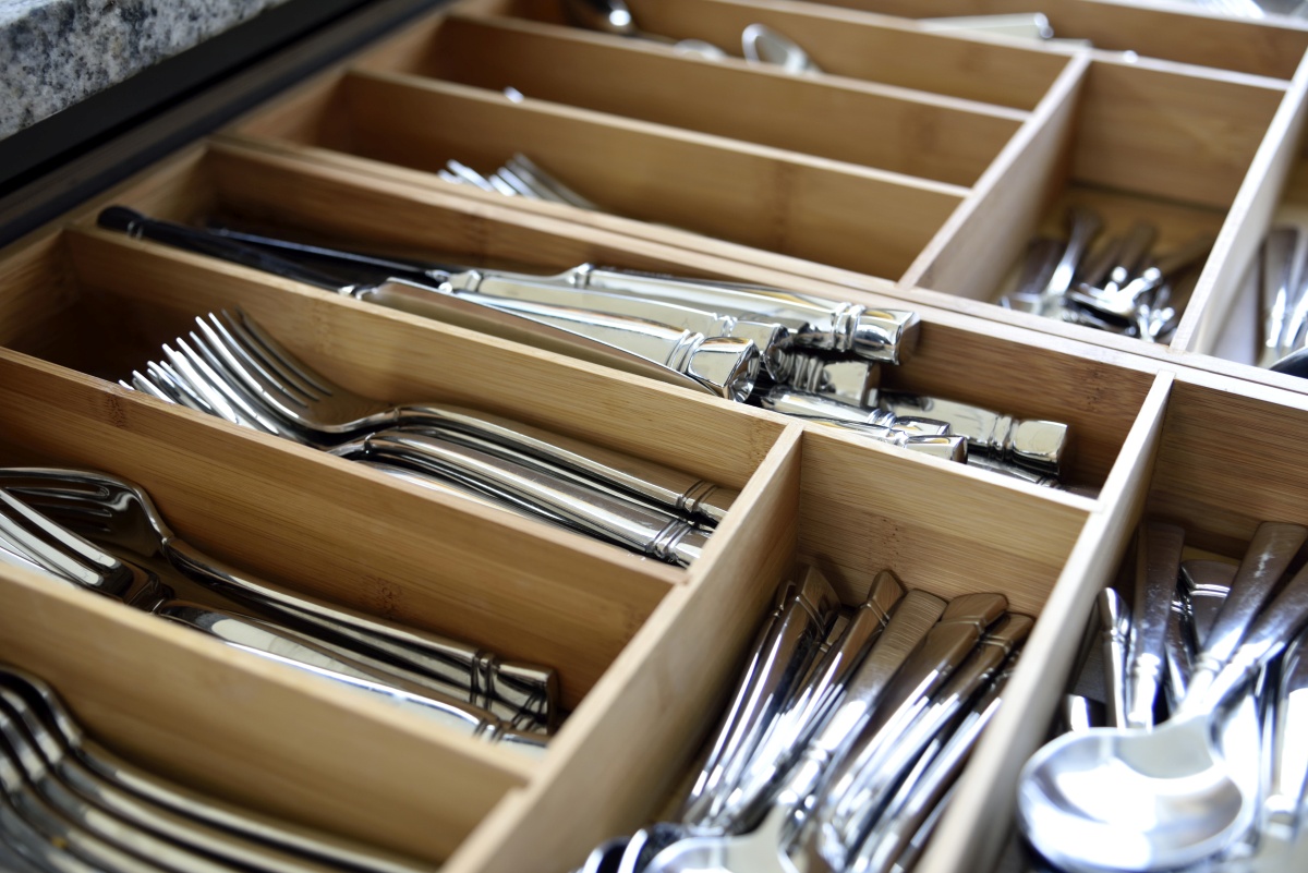 Najbardziej typowym kuchennym organizerem jest wkład na sztućce – to doskonały sposób ich przechowywania. Wkłady umieszcza się najczęściej w niskich szufladach (tj. takich o wysokości około 14cm – dokładny wymiar może się różnić w zależności od producenta), ewentualnie w szufladzie wewnętrznej umieszczonej w środku szafki. Wkłady mogą być wykonane z tworzywa sztucznego lub z drewna. Te ostatnie szczególnie dobrze prezentują się w kuchniach aspirujących do miana luksusowych. Ich niezaprzeczalną zaletą jest elegancki wygląd, ale również w przypadku niektórych modeli możliwość samodzielnej konfiguracji ułożenia poszczególnych przegródek. Niektóre drewniane wkłady na sztućce są rozsuwane, dzięki czemu można dopasować je do różnej szerokości szuflad.